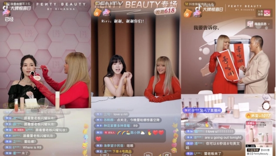 5 月 21 日晚间,流行天后 &「FENTY BEAUTY BY RIHANNA」品牌创始人蕾哈娜(Robyn Rihanna Fenty)开启抖音直播首秀,先后亮相 @琦儿Leo、@深夜徐老师 以及 FENTY BEAUTY BY RIHANNA 品牌的抖音官方旗舰店直播间。