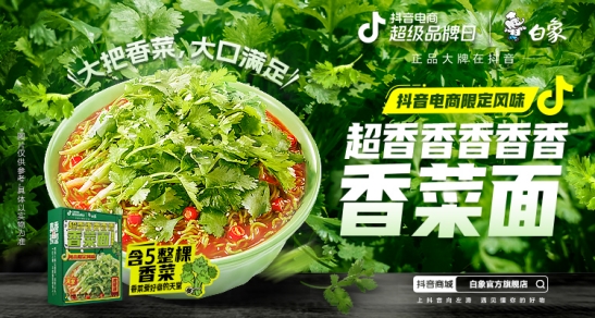 从「抖音商城·大牌惊喜日」走出来的香菜面,帮助白象在线下传统及新零售渠道打开了全新局面,在 B端(行业端)产生深远影响,白象品牌也持续基于该产品,去撬动实现新的品牌价值。