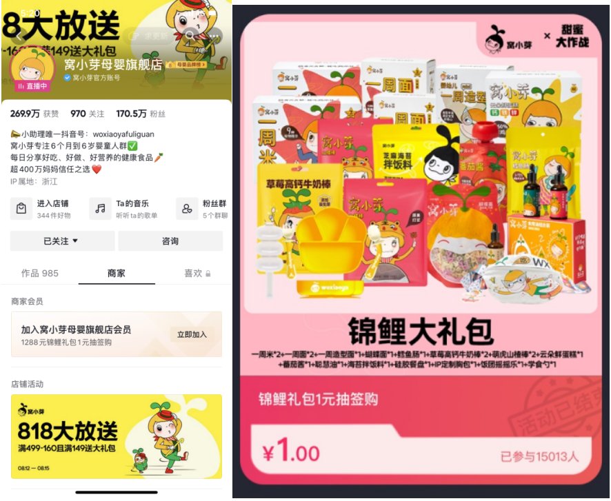 818期间,窝小芽定制了内含19件产品的锦鲤礼包,1元抽签购。在吸引更多新会员的同时,也促进了老会员的活跃度。活动期间,参与人数超过1.5万。