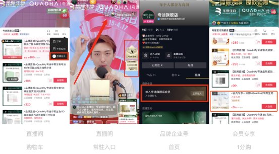 在抖音818发现好物节期间,夸迪不仅在多场景齐发力,广泛布局会员招募渠道,将会员招募放置于整体营销的关键位置。入口包括了直播间购物车、直播间贴片链接、品牌企业号首页、店铺首页、支付成功页、品牌专区等8个。在直播间,夸迪以“会员派样”的形式,通过引导用户1分购次抛体验装,开通会员,快速吸粉。