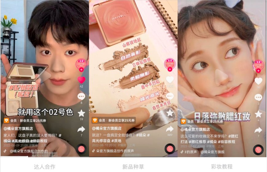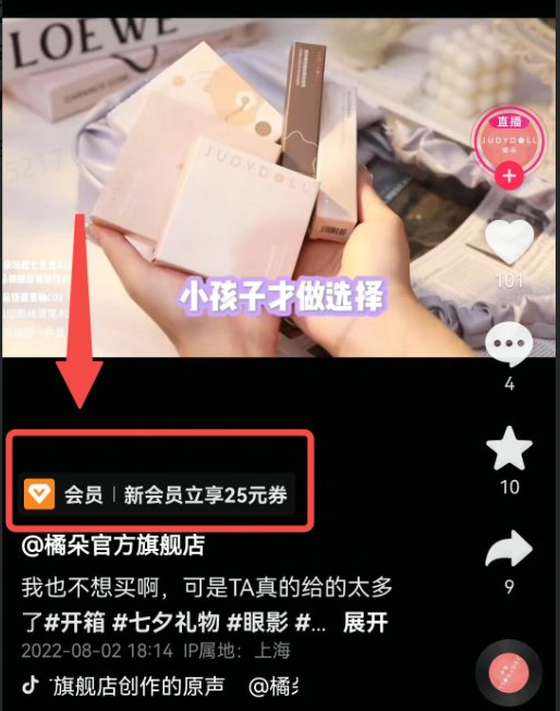 在内容上,橘朵主要通过化妆教学短视频种草产品,以“有章可循”的短视频方法论输出给达人,高效吸纳粉丝。如,在1-5秒,通过画面、方言等,形成氛围感,吸引用户停留;在5-10秒,传递核心信息点,让潜在用户关注;在10-15秒,透出产品卖点,种草用户。为了实现高效会员招募,橘朵短视频挂上了入会组件,以“新会员立享25元券”等形式吸引用户领券拔草,视频最后加箭头引导领券入会,实现种草、拔草的一体化。